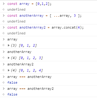 spread 연산자와 concat 메서드를 사용해 기존 배열은 변하지 않은 상태로 그대로 두면서 새로운 배열을 만들어 냅니다. 그 결과 배열들을 비교했을 때 서로 다른 값이라고 나옵니다. 이번에는 객체의 경우를 살펴볼게요.
