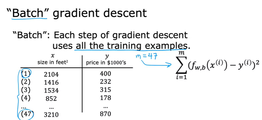 이러한 gradient descent 는 보통 "Batch" gradient descent 라고 부른다. 배치라고 부르는 이유는 모든 학습 데이터들을 일부 데이터만 학습하는 것이 아니라 모든 데이터를 동원해서 학습하기 때문이다.